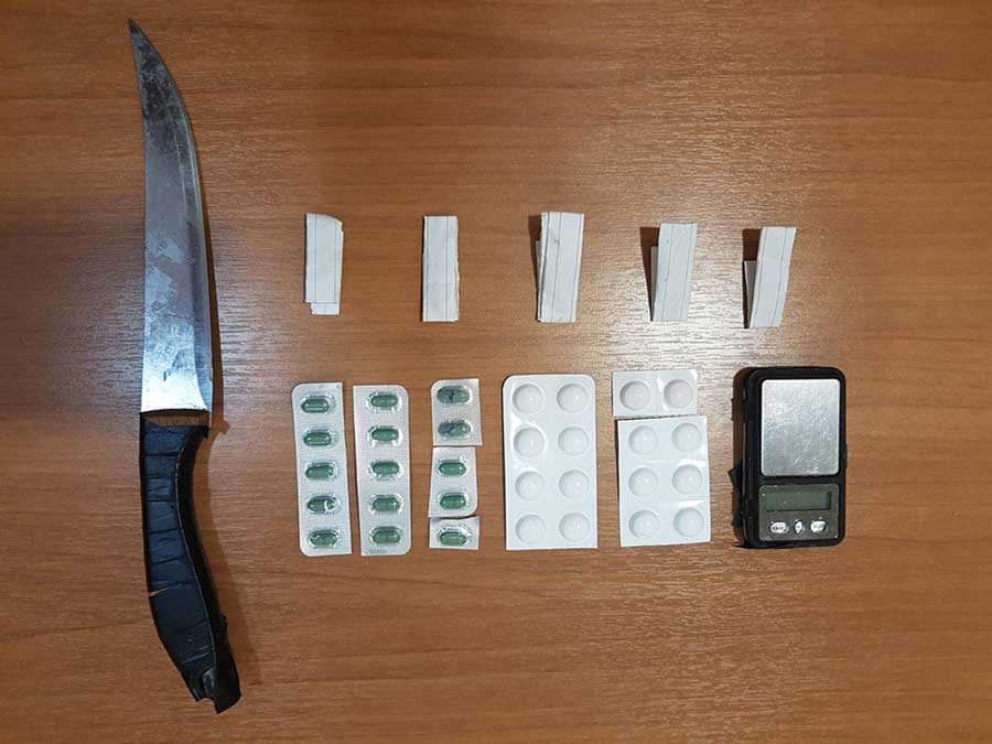 ακριβείας, -31- ναρκωτικά χάπια και μαχαίρι με μήκος λάμας -15- εκατοστά.