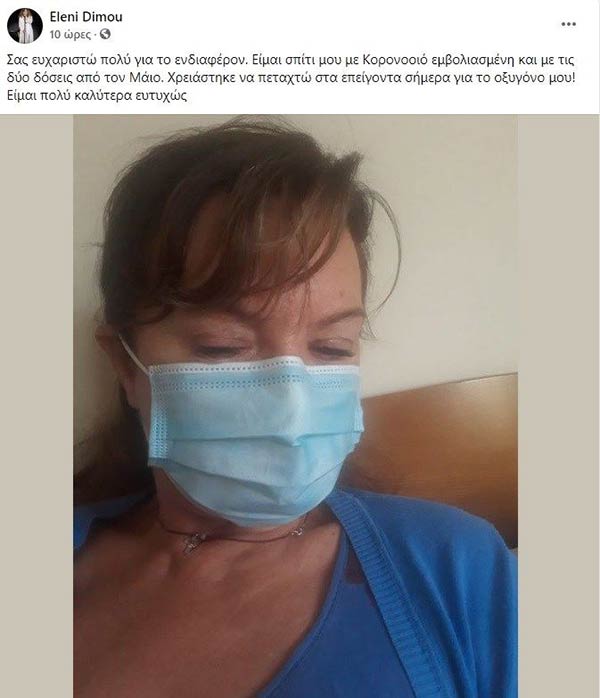 Συγκεκριμένα, η γνωστή τραγουδίστρια δημοσίευσε στον προσωπικό της λογαριασμό στο Facebook μια φωτογραφία στην οποία φορώντας την ιατρική μάσκα, αναφέρει νοσεί και ότι είναι εμβολιασμένη και με τις 2 δόσεις από τον Μάιο και χρειάστηκε να μεταφερθεί στα επείγοντα για να της χορηγηθεί οξυγόνο.