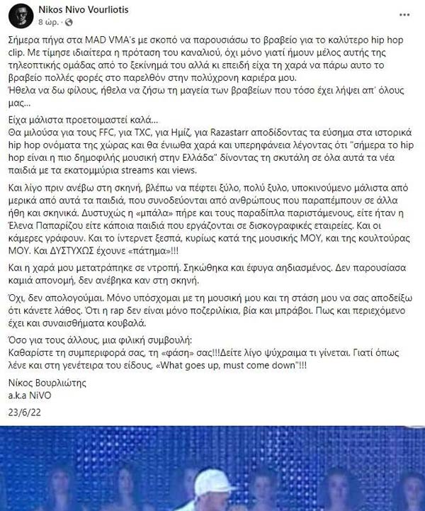 ]]>Τη μουσική γιορτή των Mad Video Music Awards αμαύρωσαν και μετέτρεψαν σε ρινγκ οι τράπερς Light και Snik, οι οποίοι δίχως ίχνος σεβασμού για τη διοργάνωση που τους φιλοξενούσε και για τους παρευρισκόμενους έπαιξαν άγριο ξύλο. Ο Νίκος Βουρλιώτης ξέσπασε για όσα συνέβησαν στα Mad Video Music Awards, με τον γνωστό ράπερ να χρησιμοποιεί σκληρές εκφράσεις.